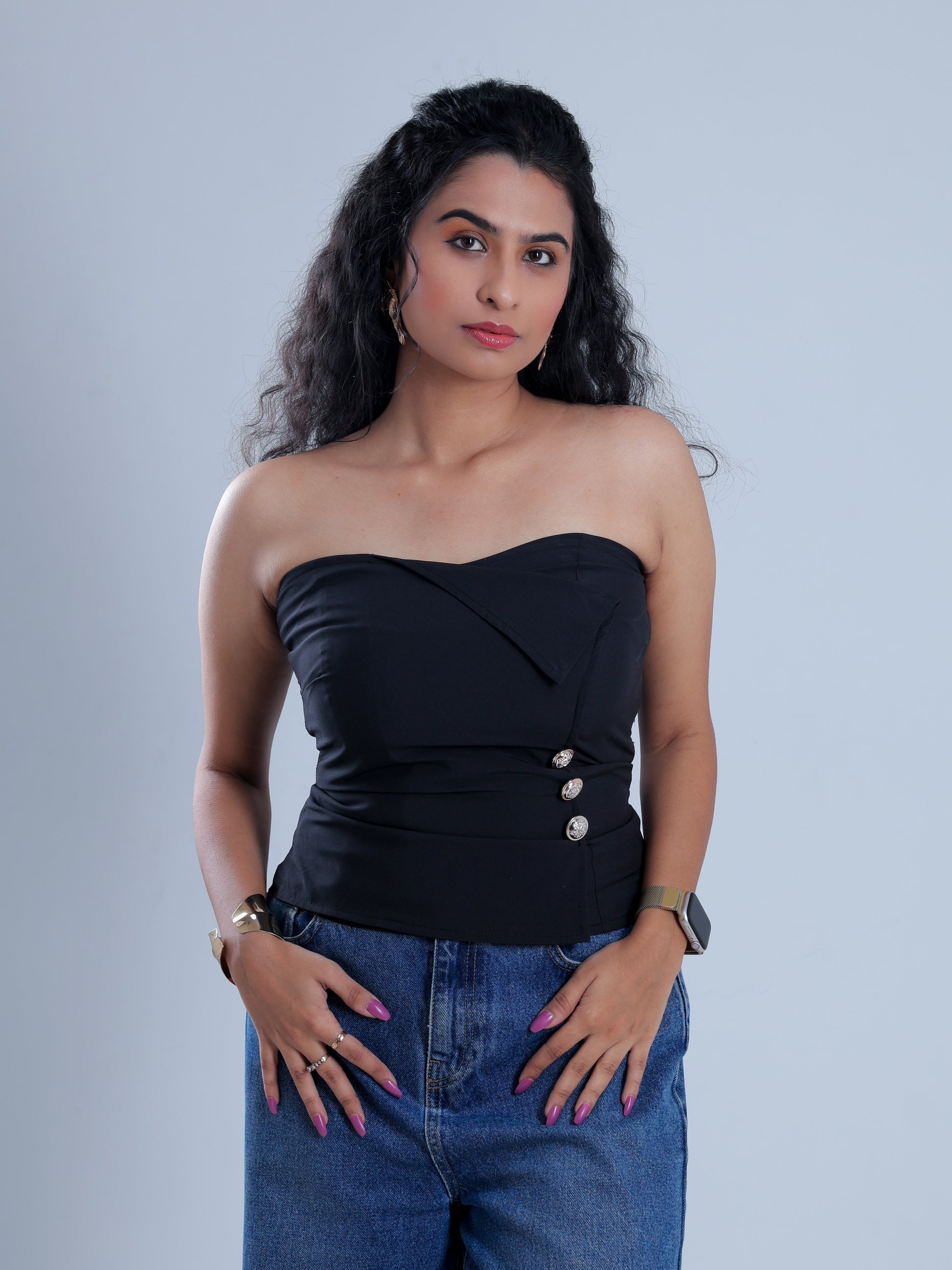 Features golden button accents on the side, adding sophistication and chic detail to the black tube top.