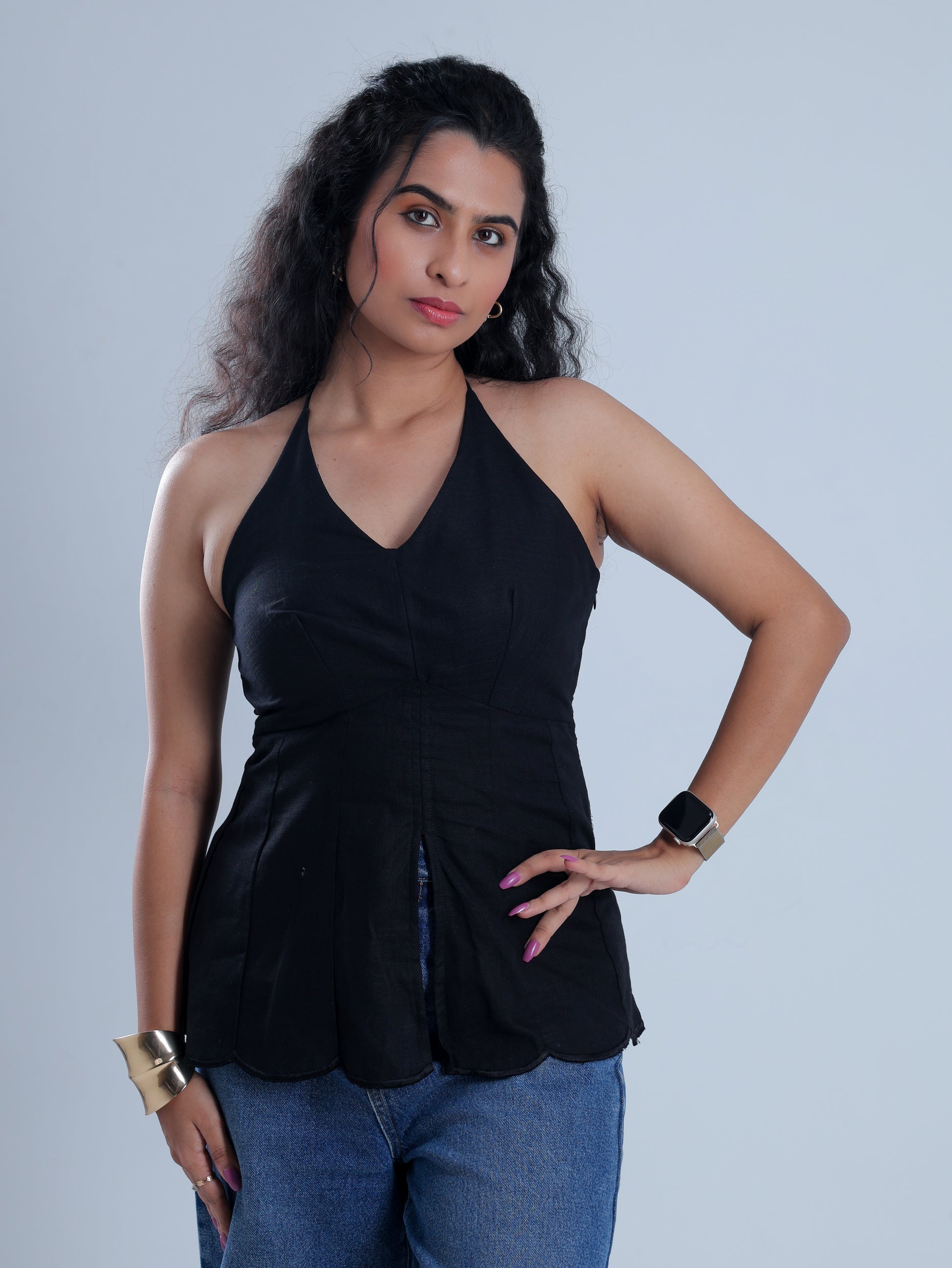 - Romantic Peplum Silhouette: The peplum silhouette with a scalloped hem adds a touch of romantic, structured elegance to this versatile halter neck top.
